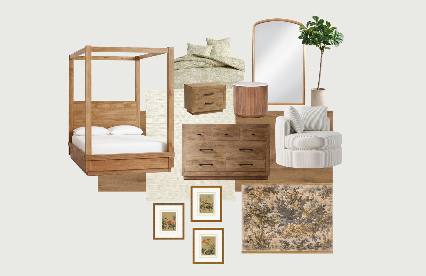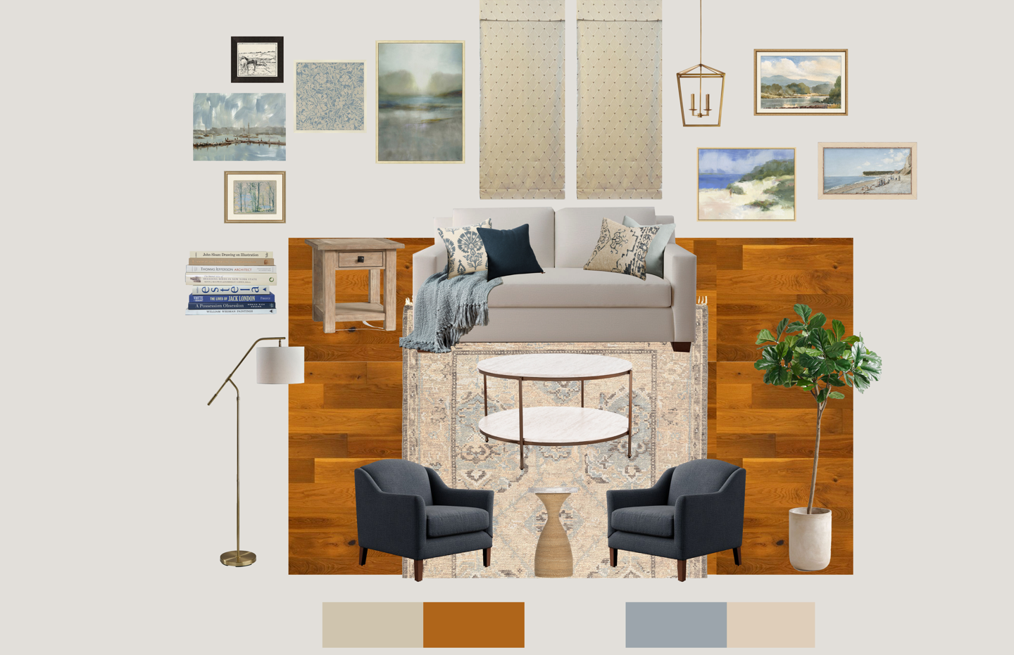 This couple had a few pieces already selected when I began helping them, so I was able to take those as inspiration as well as a home visit, and apply that to their design board. Seeing the existing elements in person helped me better understand their style and how they use their space. It also allowed me to identify opportunities for cohesion and functionality. From there, I built out the rest of the design board to complement their chosen items, while introducing new textures, colors, and pieces that enhanced the overall vision and brought a sense of harmony to the space.